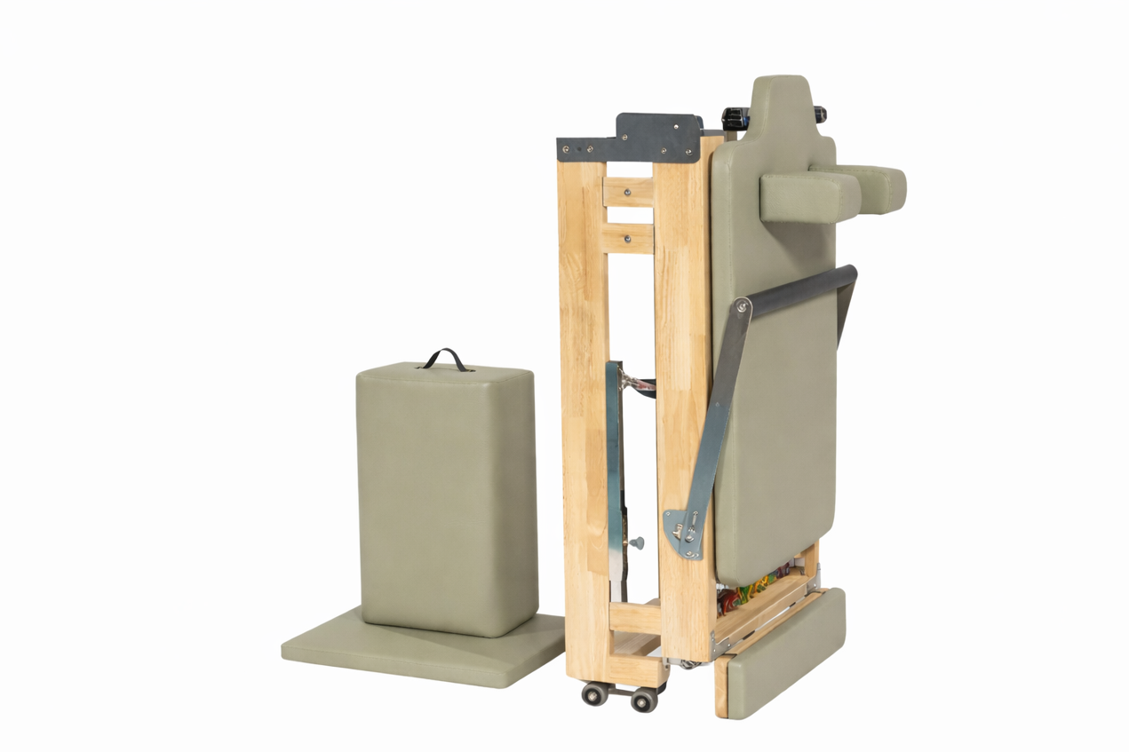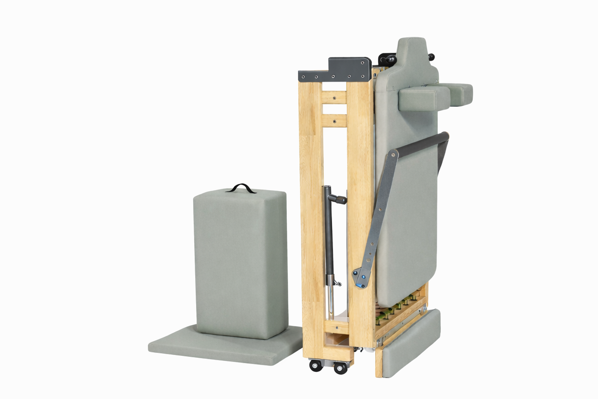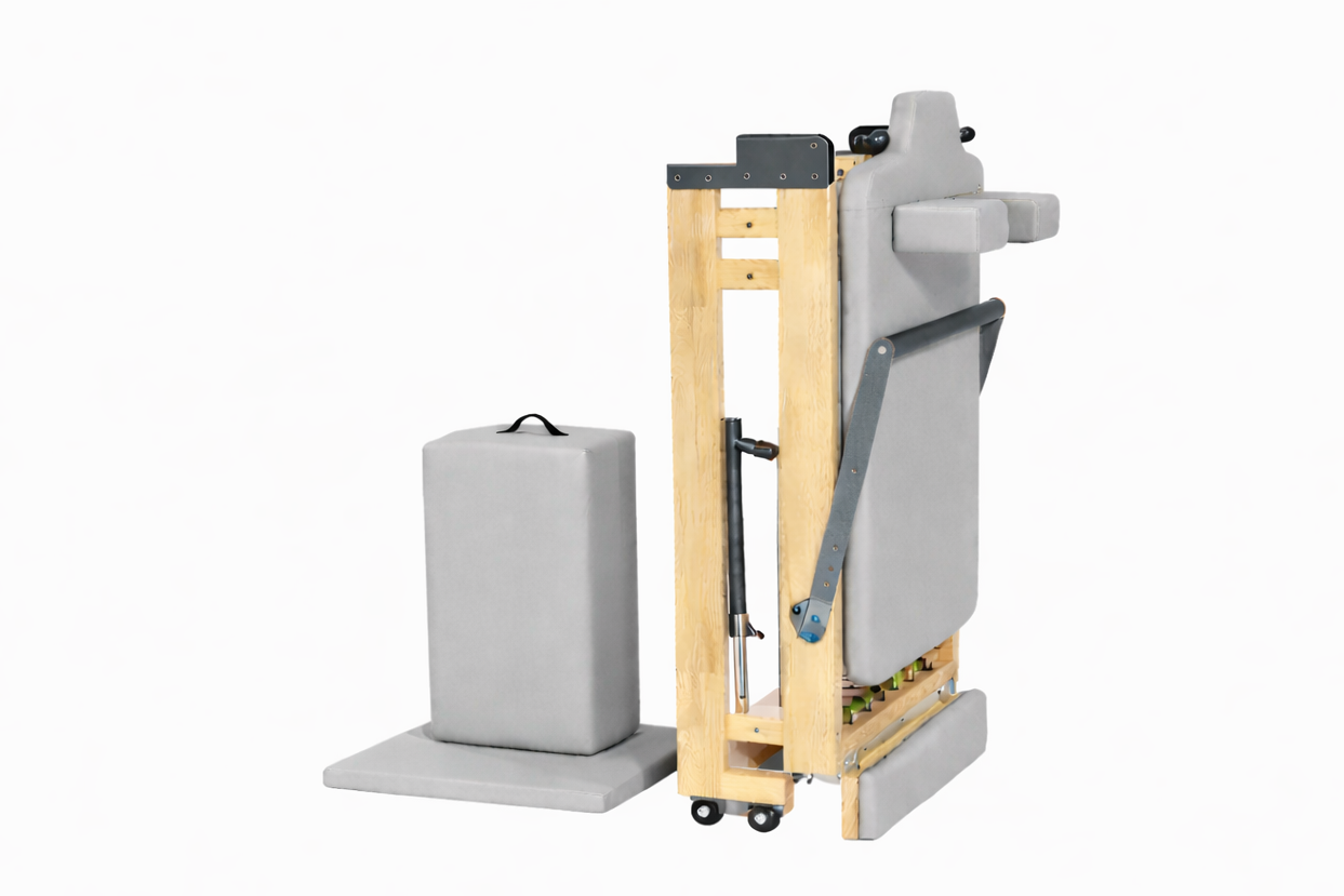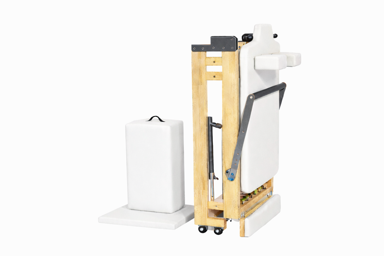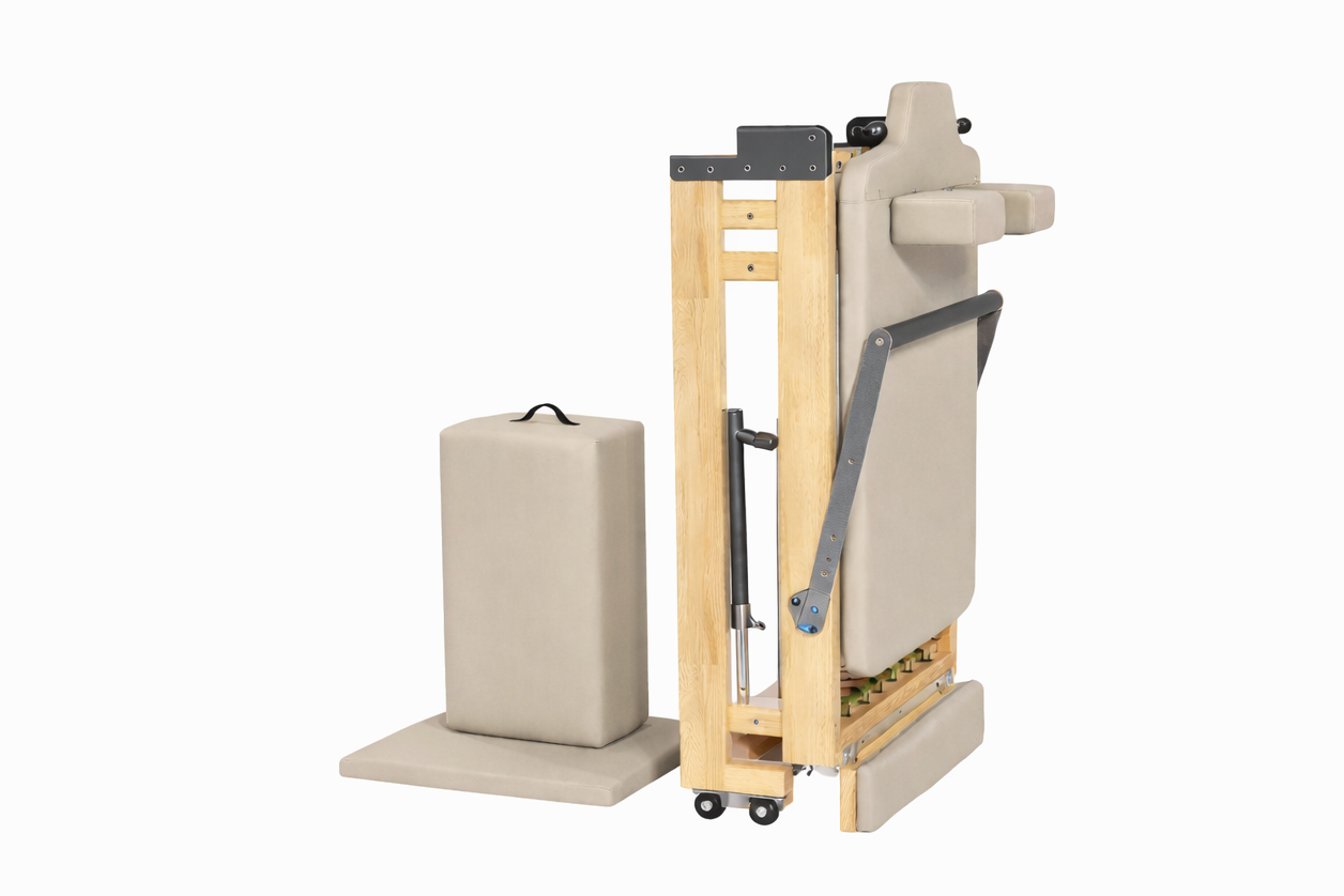 Crafted from solid oak and precision-engineered with stainless steel and aluminum components, this reformer delivers smooth, controlled resistance and outstanding stability for beginners through advanced practitioners. Its refined foldable design allows for easy storage when not in use, without compromising the feel, strength, or flow of a full-size studio machine.